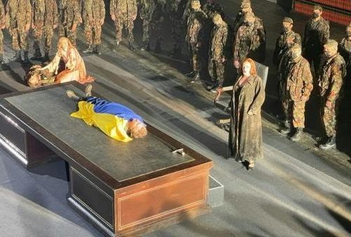 Andreas Schager als toter Siegfried in Ukraine-Flagge