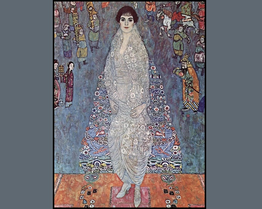 Elisabeth wird als moderne, selbstbewusste Frau dargestellt, umgeben von chinesischen Motiven und exotischen Figuren im Hintergrund – ein Zeugnis für Klimts Faszination für asiatische Kunst.